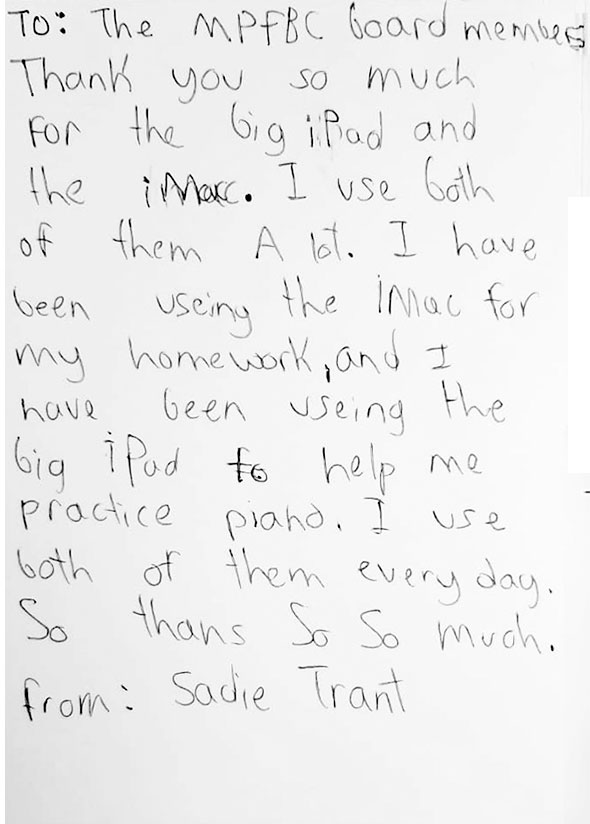 In August 2020, the MPFBC provided funding to Sadie for the purchase of several pieces of equipment, including an iMac, an iPad Pro, and applicable software, to assist with her activities. It was a pleasure for the MPFBC board to receive this thank you card from Sadie and we are very happy to know that she has and will continue to benefit greatly from the equipment.